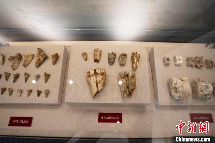 华龙洞遗址陈列馆展厅展陈的部分动物骨头化石。东至县委宣传部供图