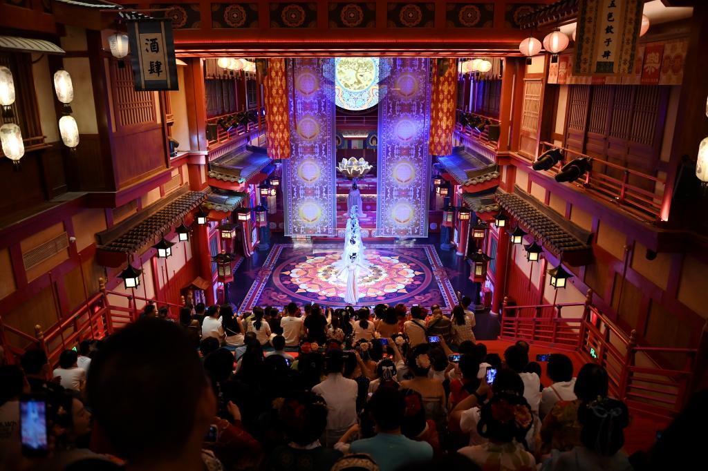 夜幕降临,大雁塔脚下人头攒动。走进长安十二时辰主题街区,恍若置身唐长安城市井街巷:酒肆茶铺鳞次栉比,霓裳羽衣舞步翩翩。游客大多身着汉服,外国面孔不时可见。