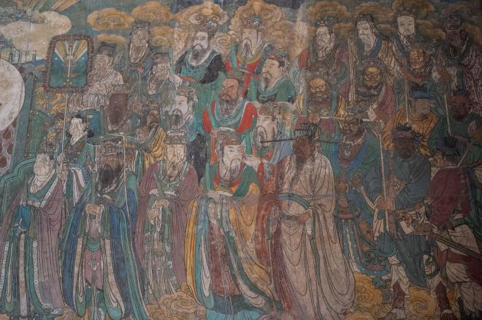走进三清殿,总长97米,平均高度4.4米的《朝元图》绘于东、北、西三面山墙。张青告诉记者,永乐宫壁画尤以三清殿《朝元图》为精,其构图宏伟、笔意流畅,290位神祇并肩接踵,衣饰神态各异,绝少雷同,“代表了元代壁画最高成就,也是迄今所知中国古代最大的人物画”。