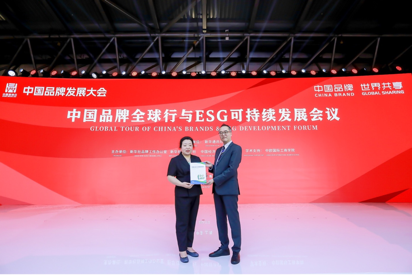 图为中国经济信息社信用风险首席分析师萨爽博士(左)与康师傅执行长室副总裁王世琦共同祝贺《中国企业ESG发展调研报告》发布