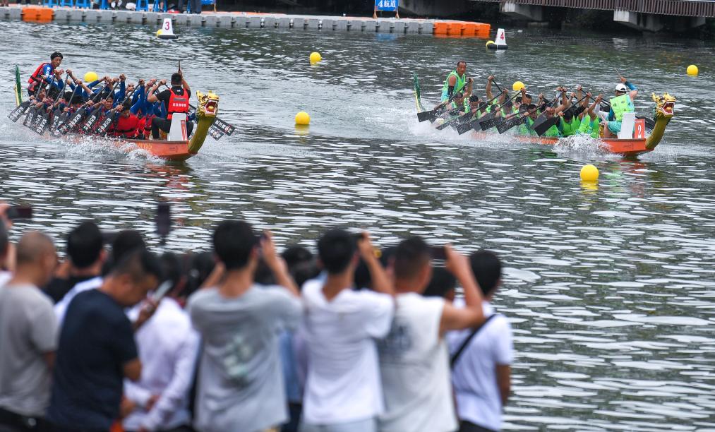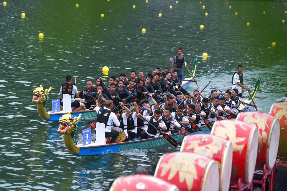 船头的鼓手一锤一锤地打着节拍,船员们整齐划一地挥动船桨,船桨与河面碰撞出激烈的水花,一艘艘龙舟在500米赛道上竞速冲刺。