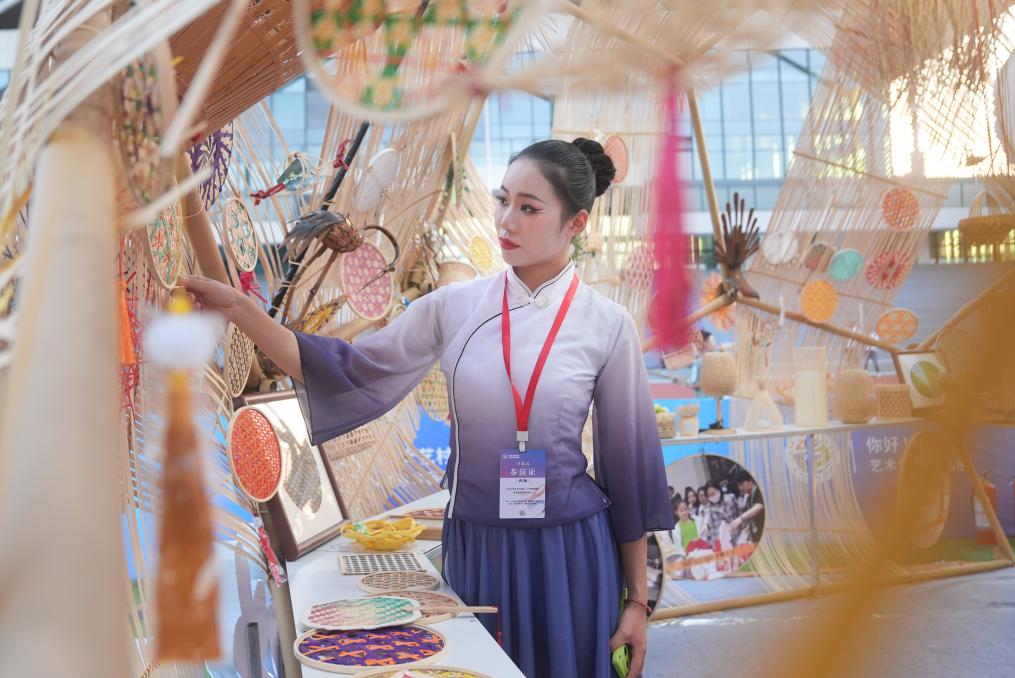 6月12日,参演学生参观湖北科技学院展出的竹编工艺品。