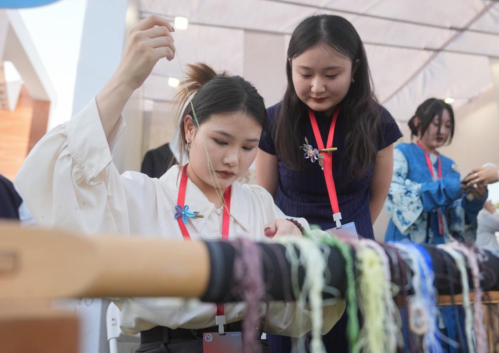 6月12日,武汉纺织大学学生在展示汉绣工艺。