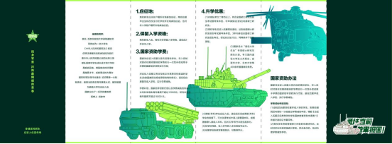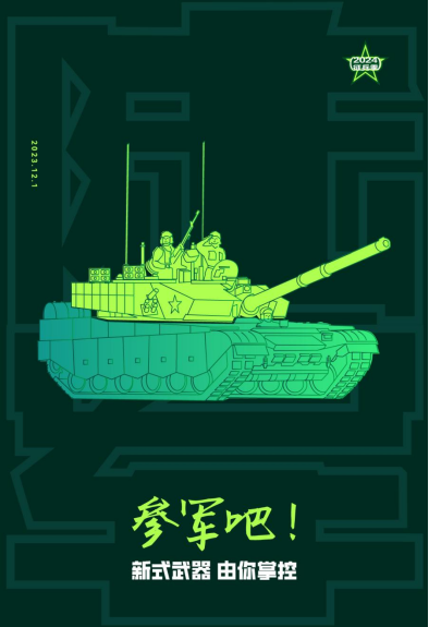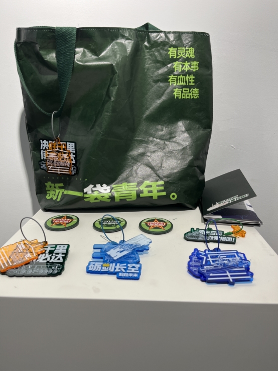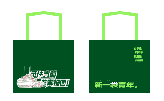其次是杜邦纸帆布包设计,版型为横版,颜色选用具有部队代表性颜色之一的军绿色,图案设计一部分为纯文字设计,借用“袋”与“代”字的谐音,既体现出产品性质,又突出表现对受众群体新一代青年的期望,希望广大有志青年积极参军,争做四有军人。另一部分为图文结合画面,通过坦克元素与激励青年参军的口号共同激发受众的参军意愿。