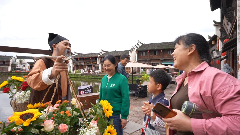 2024年“五一”假期,诸葛村推出“婺剧快闪”活动,演员与游客互动。(受访者供图)
