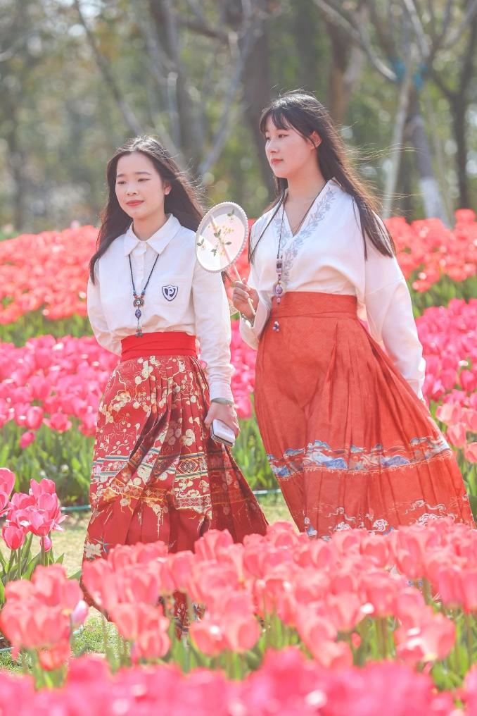 3月12日,江西南昌凤凰沟,两位身穿中国传统服饰马面裙的游客从郁金香花海中走过