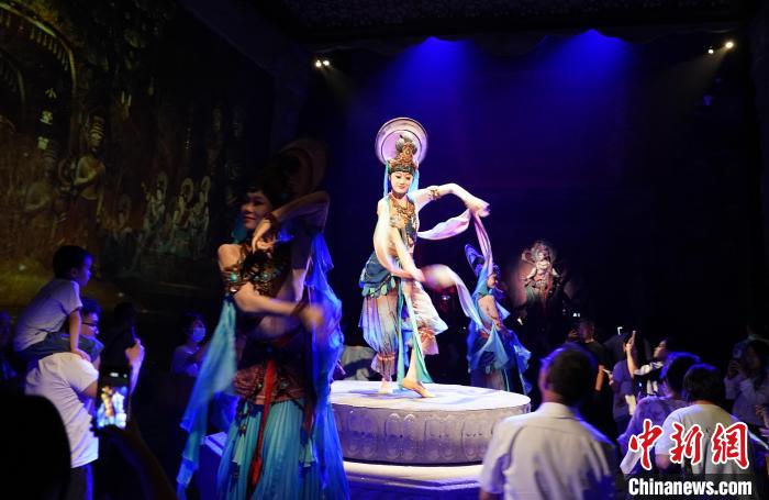 《乐动敦煌》是全球首部洞窟式沉浸体验剧,利用真人与数字影像虚实交换实现沉浸式体验。图为2023年8月28日晚,《乐动敦煌》演出。(资料图)中新社记者 毛建军 摄