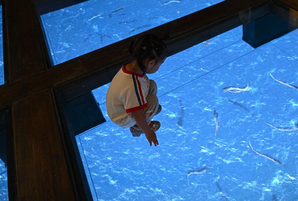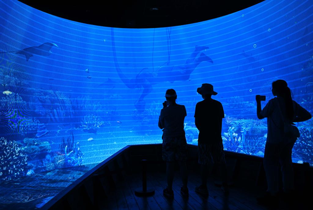 7月26日,游客在海南疍家博物馆模拟的疍家渔排上观看展现渔排底部水产养殖的动画。