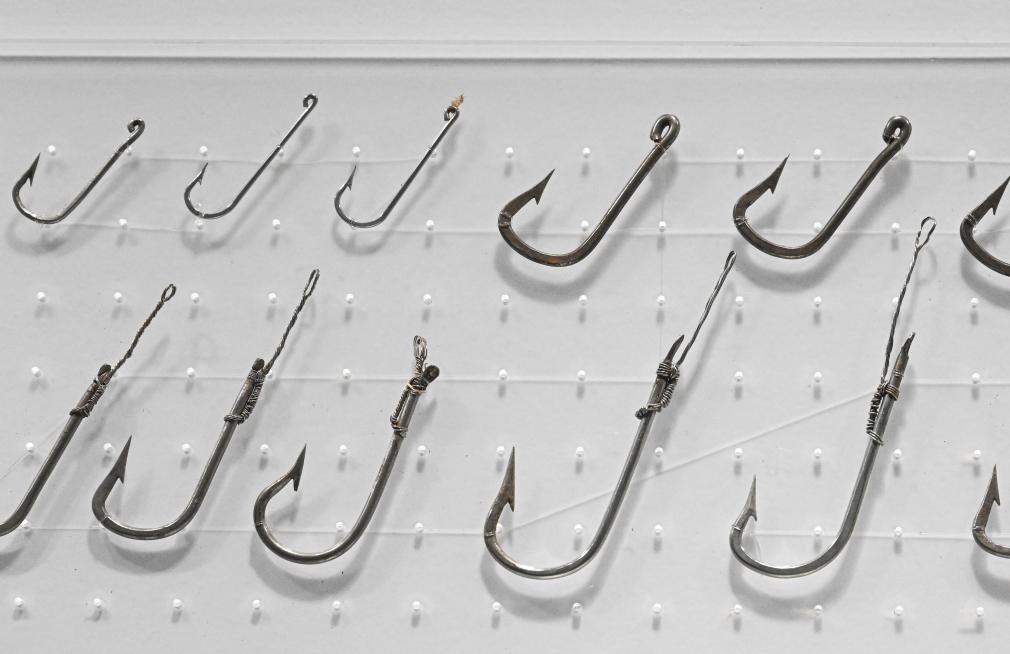 7月26日在海南疍家博物馆拍摄的疍家人用于捕鱼的各式鱼钩。