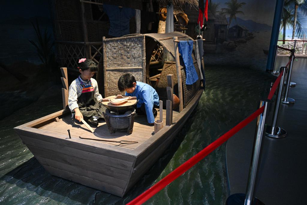 7月26日在海南疍家博物馆拍摄的展示疍家人生活在住家船上的场景。早期疍家人大多居住在船上,每户一般有一至两艘船用于作业和居住。