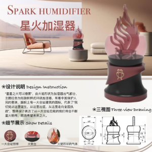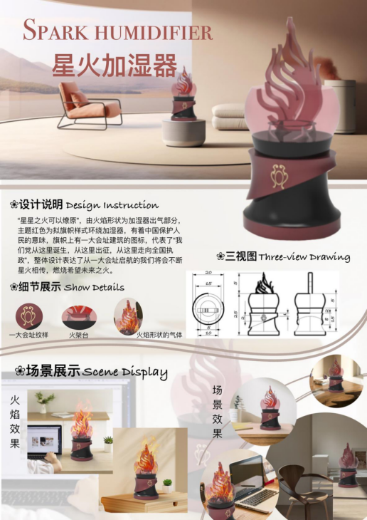 “星星之火可以燎原”,由火焰形状为加湿器设计出气部分,主题红色为拟旗帜样式环绕加湿器,星火相传,燃烧希望未来之火。