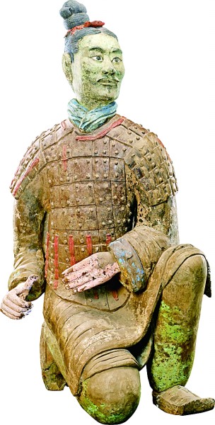 秦始皇帝陵博物院文物修复专家兰德省笑着介绍:“秦俑原本有朱红、粉绿、紫、蓝、赭等多种颜色,俑身要先刷过一层生漆,再着一层颜料。但埋在地下2000余年,秦俑的彩绘层已十分脆弱。出土后,随着湿度和温度发生变化,生漆便会弯曲卷翘,连带上面的颜料一起脱落。打一针聚乙二醇保护剂,它可以渗透到秦俑内部并形成保湿加固层,防止生漆失水而脱落。”