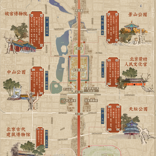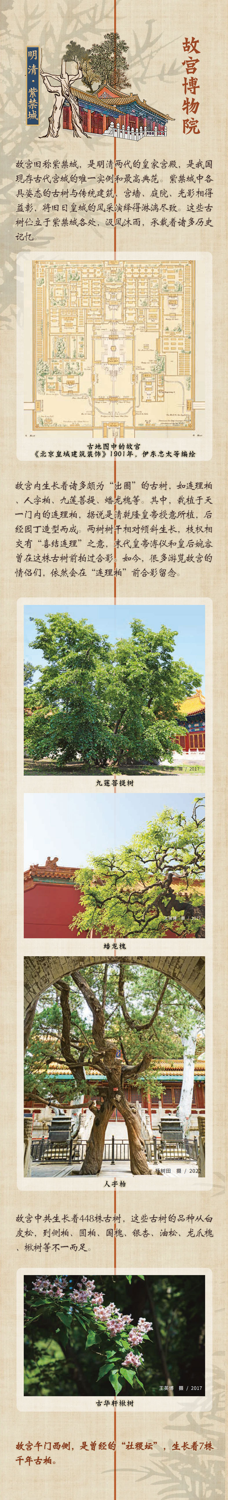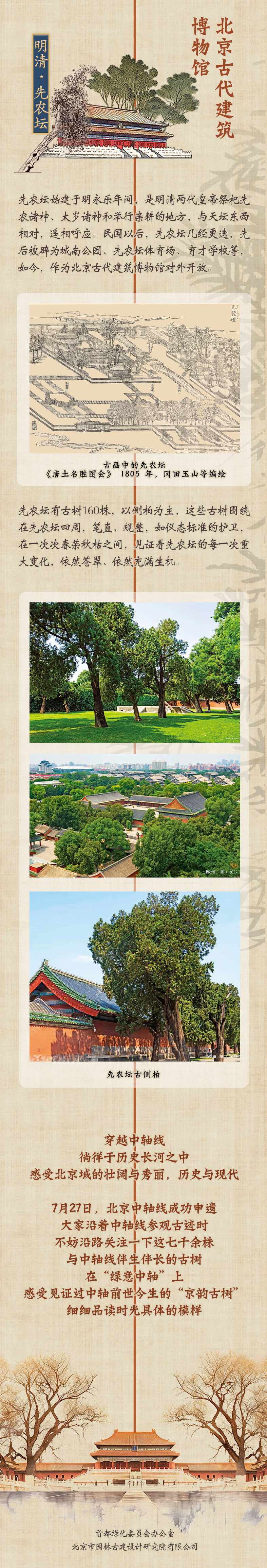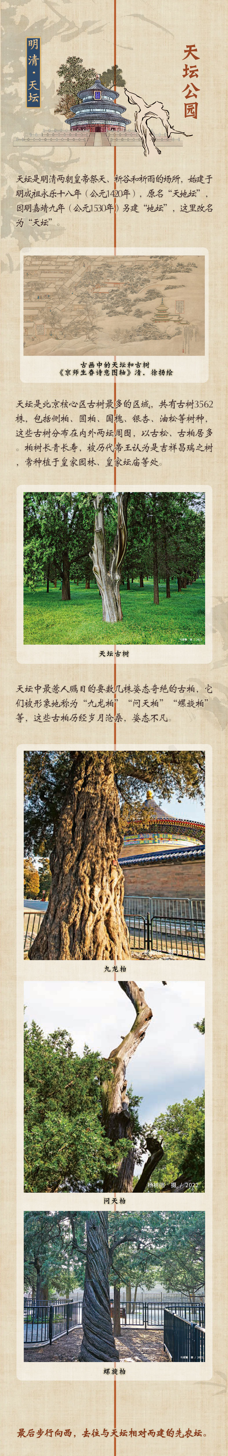 经过对北京中轴线沿线的古树资源的梳理,首都绿化委员会办公室联合北京市文化和旅游局特别推出北京中轴线古树主题游线。游线涉及中轴线沿线的景山、故宫、社稷坛、太庙、天坛、先农坛,六大古树群约6600株特色古树,诚邀市民游客打卡,在名胜古迹中感受古树的魅力,时光变迁之美。