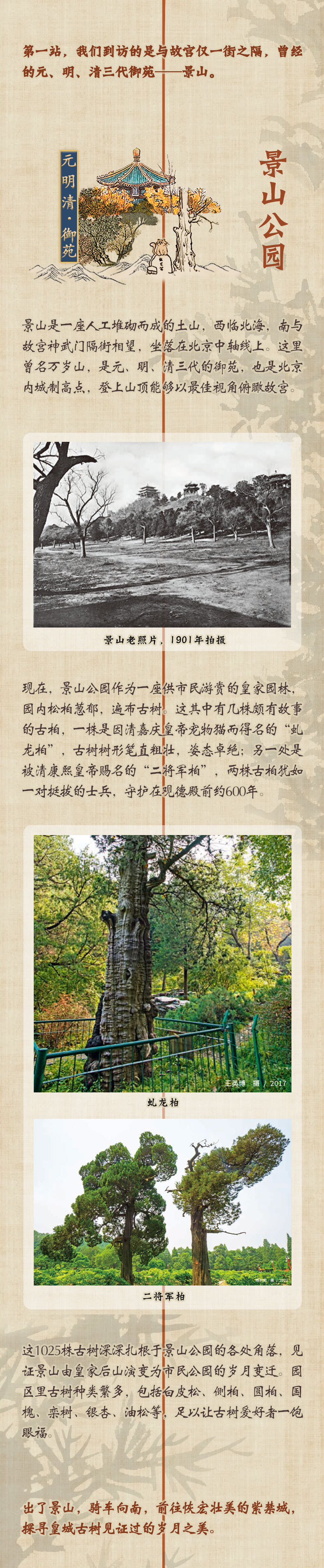 如今,景山公园作为一座供市民游赏的皇家园林,园内松柏葱郁,遍布古树,共有包括白皮松、侧柏、圆柏、国槐、栾树、银杏、油松等古树1025株。