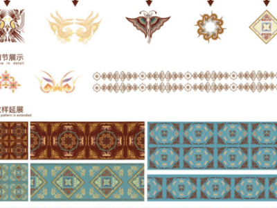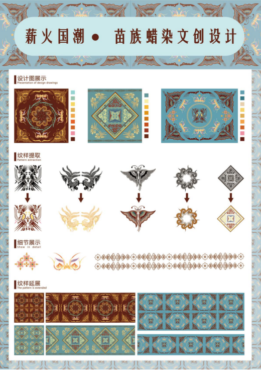 该作品把苗族蜡染代表纹样提取出来,如鸟纹、蝴蝶纹、花卉纹等。再把苗族蜡染中提取到的纹样进行排列组合,并结合敦煌的色彩进行创作,苗族蜡染的文创多为深蓝色,因此此作品想要把其多元化展示在大众面前。