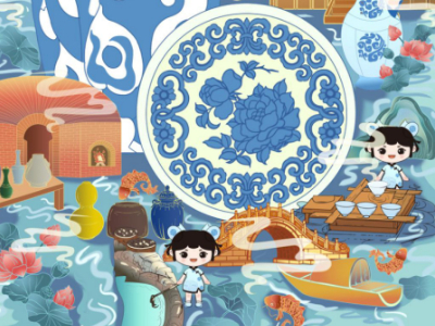 产品通过景德镇手工制瓷技艺将传统纹样与现代艺术图形相融合,从制瓷的工艺流程绘画四个小场景,再通过江西特有的建筑物、植物、动物、景物进行画面的装饰,能更好的看出制瓷的过程,IP为卡通的人物形象,以瓷器作为装饰点缀。