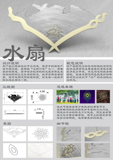 本产品以傣族泼水节为灵感,扇子中的图案是佛教“五树六花”之一,有着美好的寓意,扇子右方把手的形态是参考孔雀羽毛的形状以及孔雀的形态,把手采用金属材质,扇子采用透明树脂材质,并且每一把扇子的水波纹都不一样。