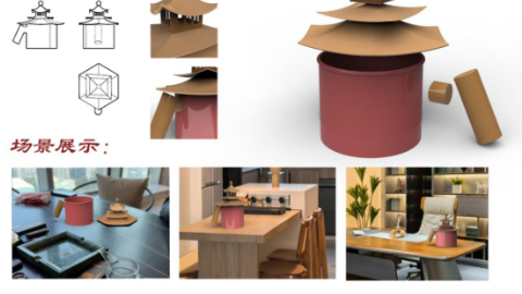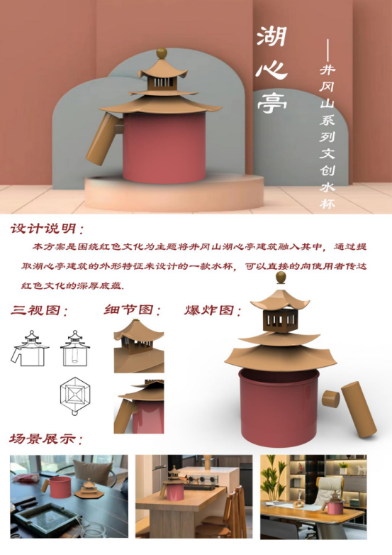 设计是围绕红色文化为主题,将井岗山湖心亭建筑融入其中,通过提取湖心亭建筑的外形特征来设计的一款水杯,可以直接向使用者传达红色文化的深厚底蕴。
