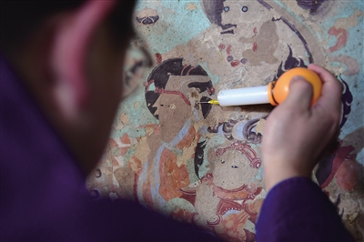 ▲工作人员在修复出现病害的壁画。记者 杜哲宇 摄