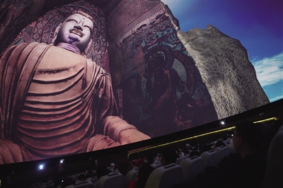 游客在莫高窟数字展示中心观看球幕电影《梦幻佛宫》。记者 陈斌 摄