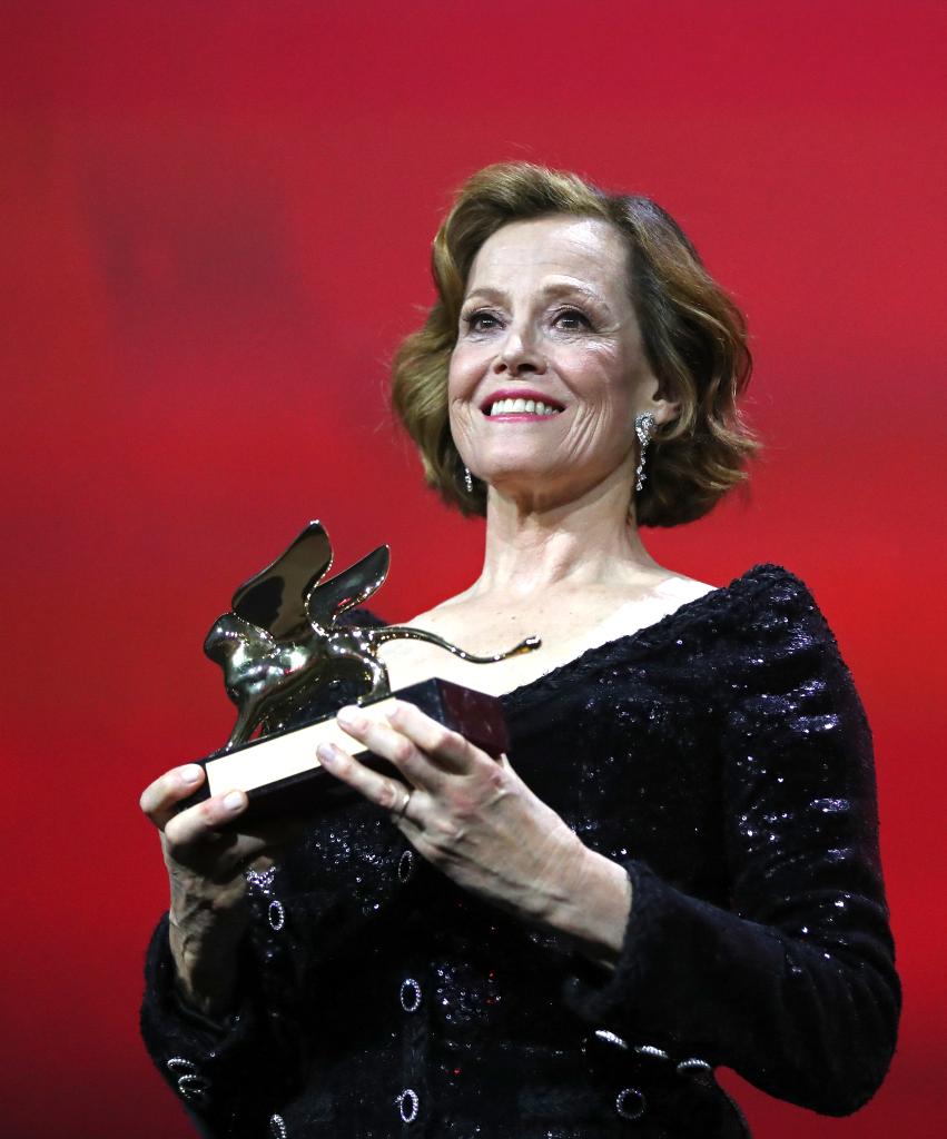 8月28日,在意大利威尼斯,西格妮·韦弗在开幕式上与奖杯合影。