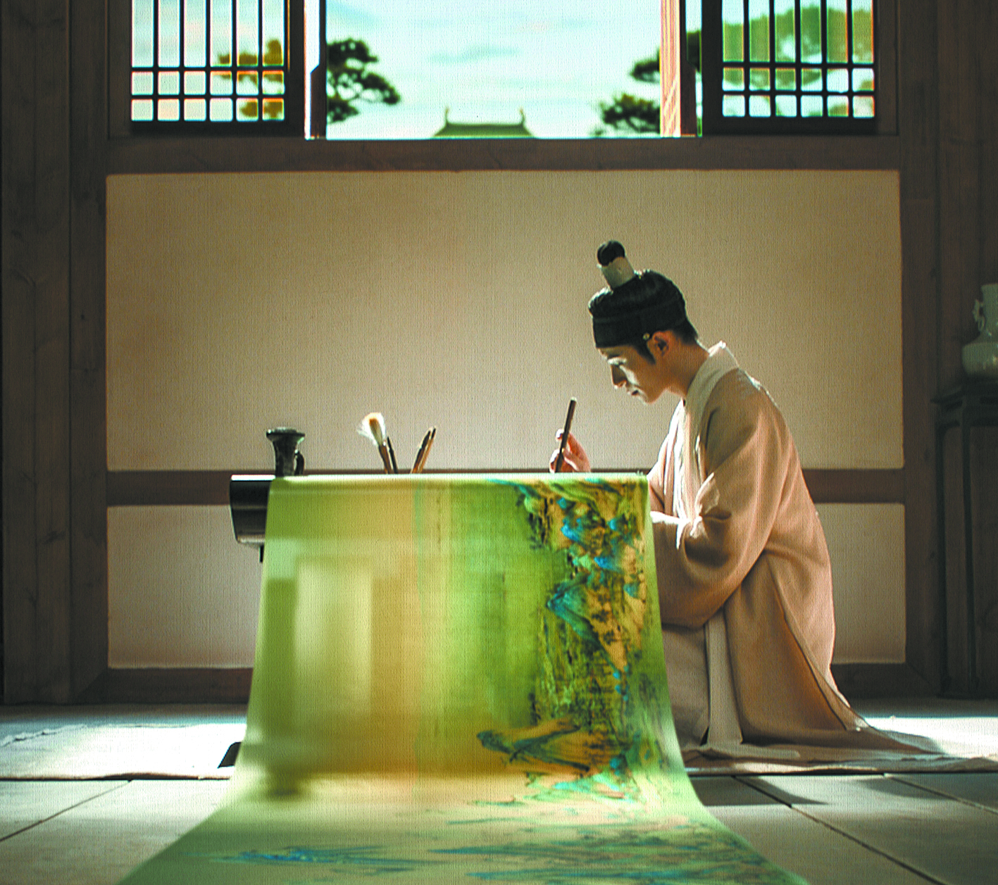 舞剧电影的本质仍是电影,追求电影叙事是电影《只此青绿》创作的题中之义。与舞蹈诗剧的精髓一致,电影叙事围绕作画与守画的千年历程展开,以画中主色调青绿为视觉线索,生动展现《千里江山图》千年不褪的色彩、无数劳动者的匠心创造,以及一代代文物工作者的接续守护,共同演绎了一幅极具中国美学理念的画卷。