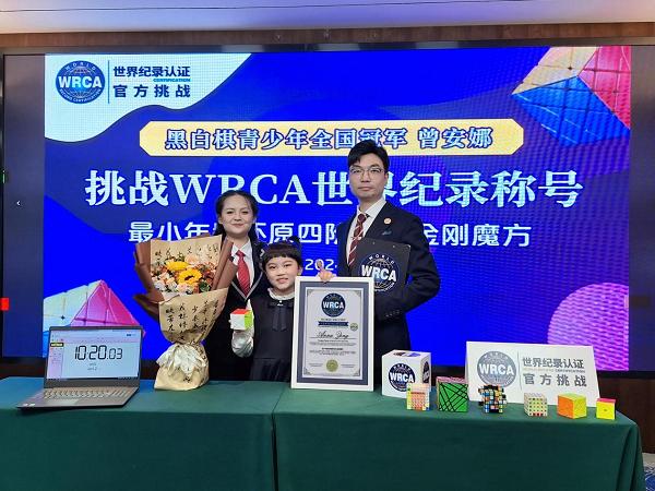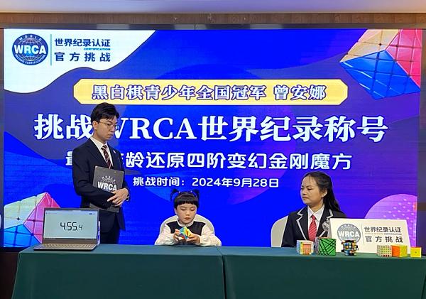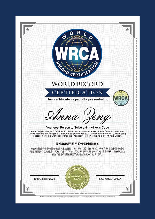2024年9月28日,来自湖南的8岁中国女孩曾安娜在40项世界纪录获得者叶佳希老师和专业魔方裁判谢玲老师的见证下,在长沙市用时10分20.03秒成功还原四阶变幻金刚魔方,经世界纪录认证(WRCA)官方审核,曾安娜成功创造“最小年龄还原四阶变幻金刚魔方”世界纪录。