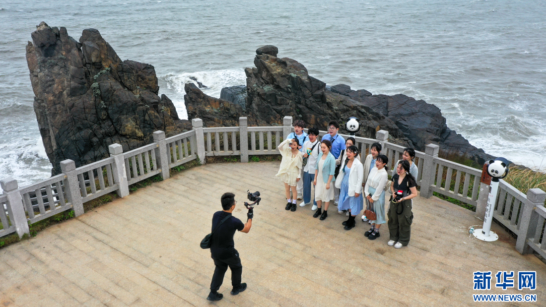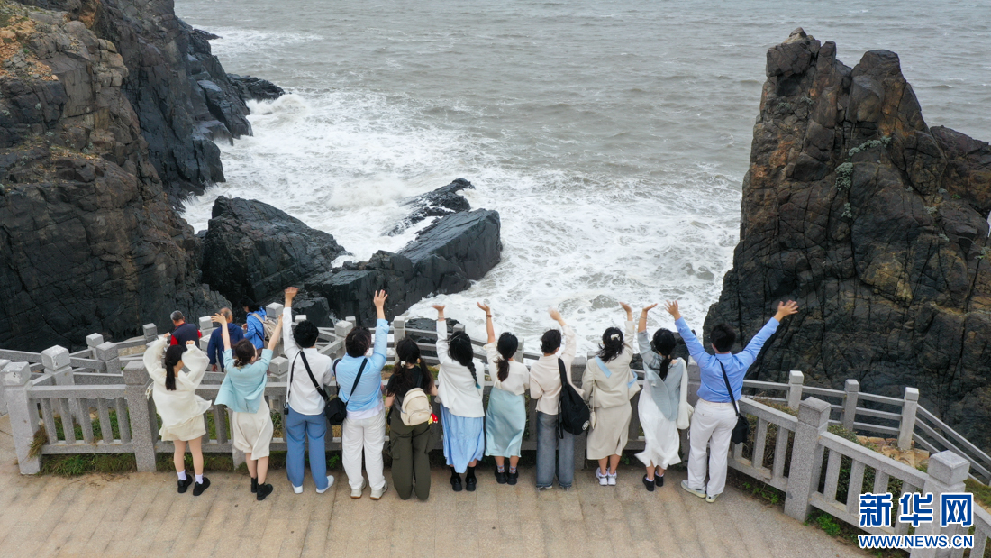 高校乐团在平潭仙人井景区打卡,感受海岛风情(无人机照片)。新华网 肖和勇 摄