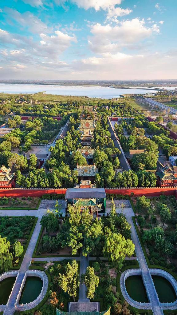 站在高处眺望,千年盐湖,碧波荡漾,中条山绵延叠翠。山水间,关圣文化建筑群从古走到今,见证了关公神化圣化的历史过程。