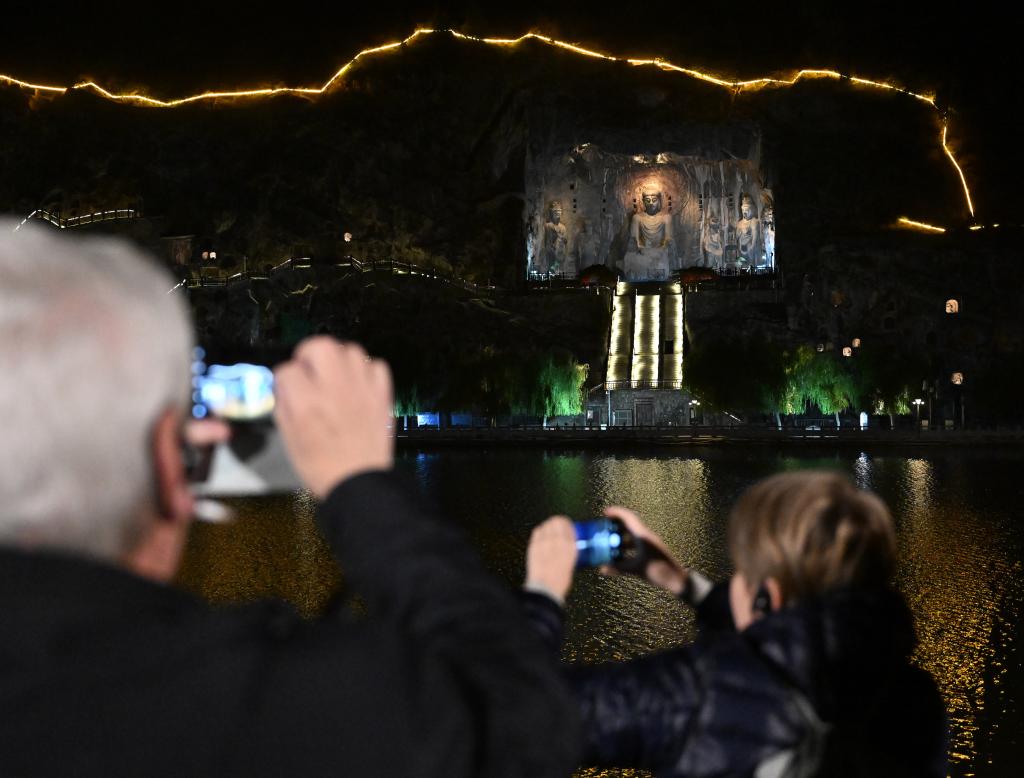 11月4日,外宾在河南省洛阳市龙门石窟景区礼佛台拍照留念。