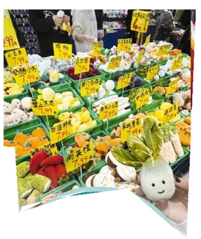 在“沉浸式打包”的层面上,万物皆可成毛绒玩具,皆可“过家家”式打包。其实,这种本土化毛绒文创产品还有不少。比如,山西太原的“刀削面”、苏州系着“防逃逸”毛线绳的“阳澄湖大闸蟹”、宁波的“中药食材”、厦门的“公仔沙茶面”以及新疆的“烤馕”等等。它们的价格也相对亲民,武汉平价版“菜市场”中的蔬菜瓜果玩偶一律7.99元一只, “阳澄湖大闸蟹”25.8元一只,“绒馍馍”19.9元一个。