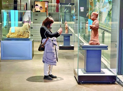 观众在四川广都博物馆拍摄拱手文官石俑。本报记者 周洪双摄