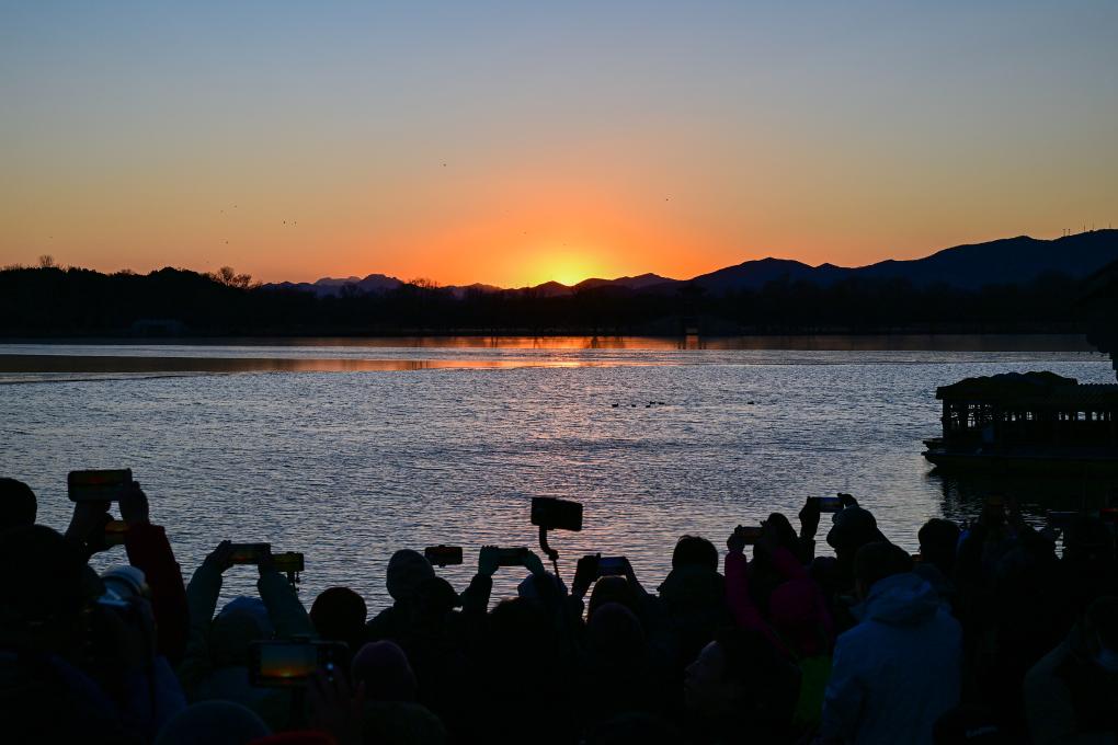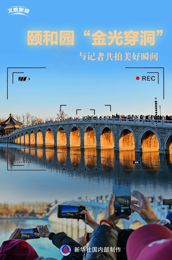 当夕阳的余晖渐渐落下,昆明湖水面泛起层层金色涟漪,许多手持“长枪短炮”的游客纷纷聚集在南湖岛上,屏息凝神,等待着十七孔桥“金光穿洞”的奇观上演。