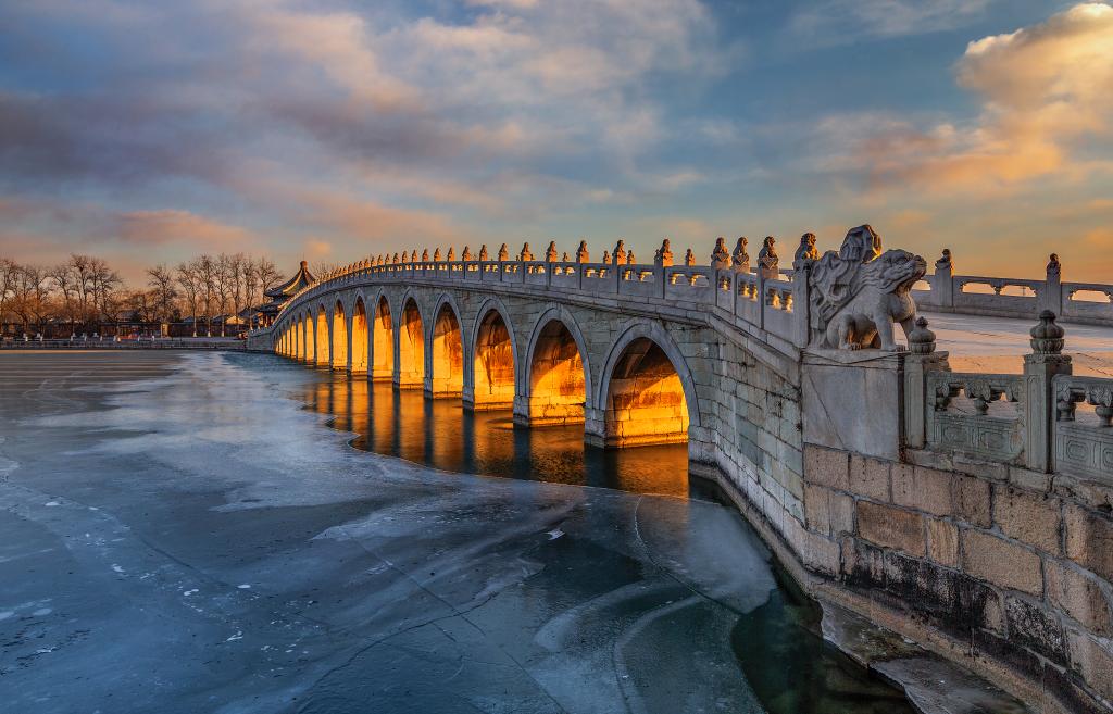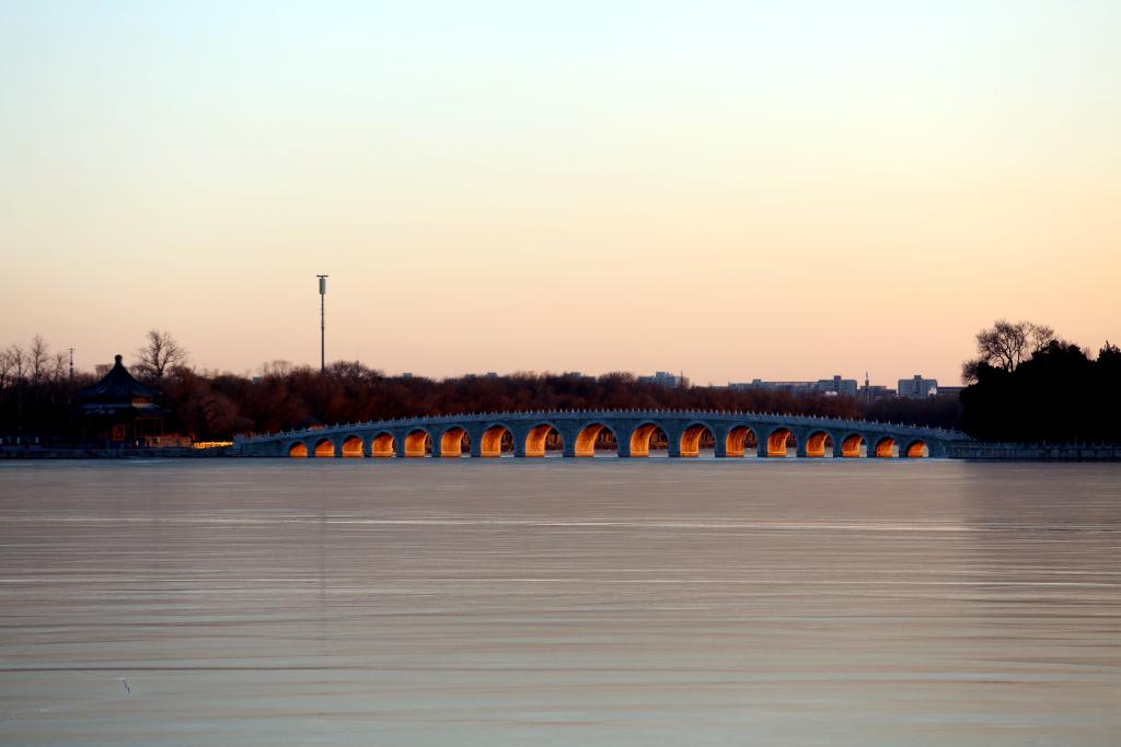 十七孔桥四时晨昏皆有不同美景,每逢冬至前后,站在南湖岛一侧,自西北向东南遥望,十七孔桥便如同被施加了魔法般,上演着“金光穿洞”的自然奇观。夕阳照射在十七个桥洞的侧壁上,仿佛十七盏明灯升于湖面,照亮了周遭的一切。