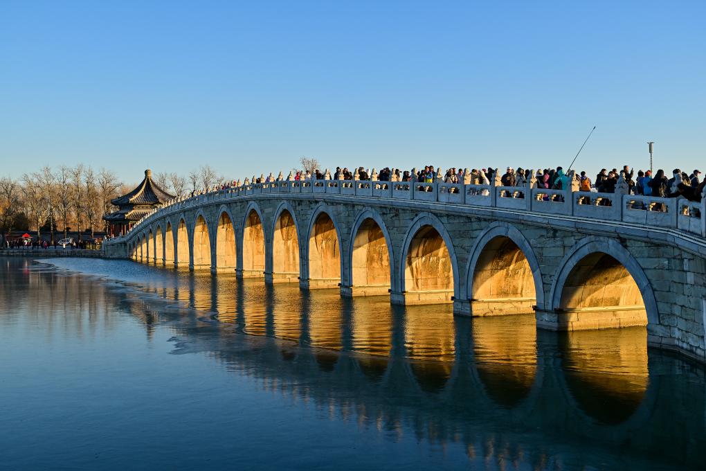 当一刹那“金光穿洞”到来时,每一位驻足观赏的游人都会屏息凝神,仿佛是历史的光影惊艳了今天的片刻时光。落日透过古老的桥洞,金光洒在每一尊石雕之上,桥影与水面交相辉映,成为了每年冬至颐和园最壮丽的景观。