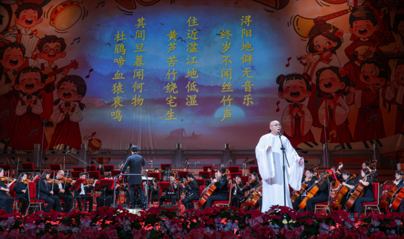 第三届北京儿童新年音乐会《凯叔·诗词遇见交响》现场,“凯叔讲故事”创始人王凯在交响乐配乐中朗诵唐代诗人白居易的长篇叙事诗《琵琶行》。