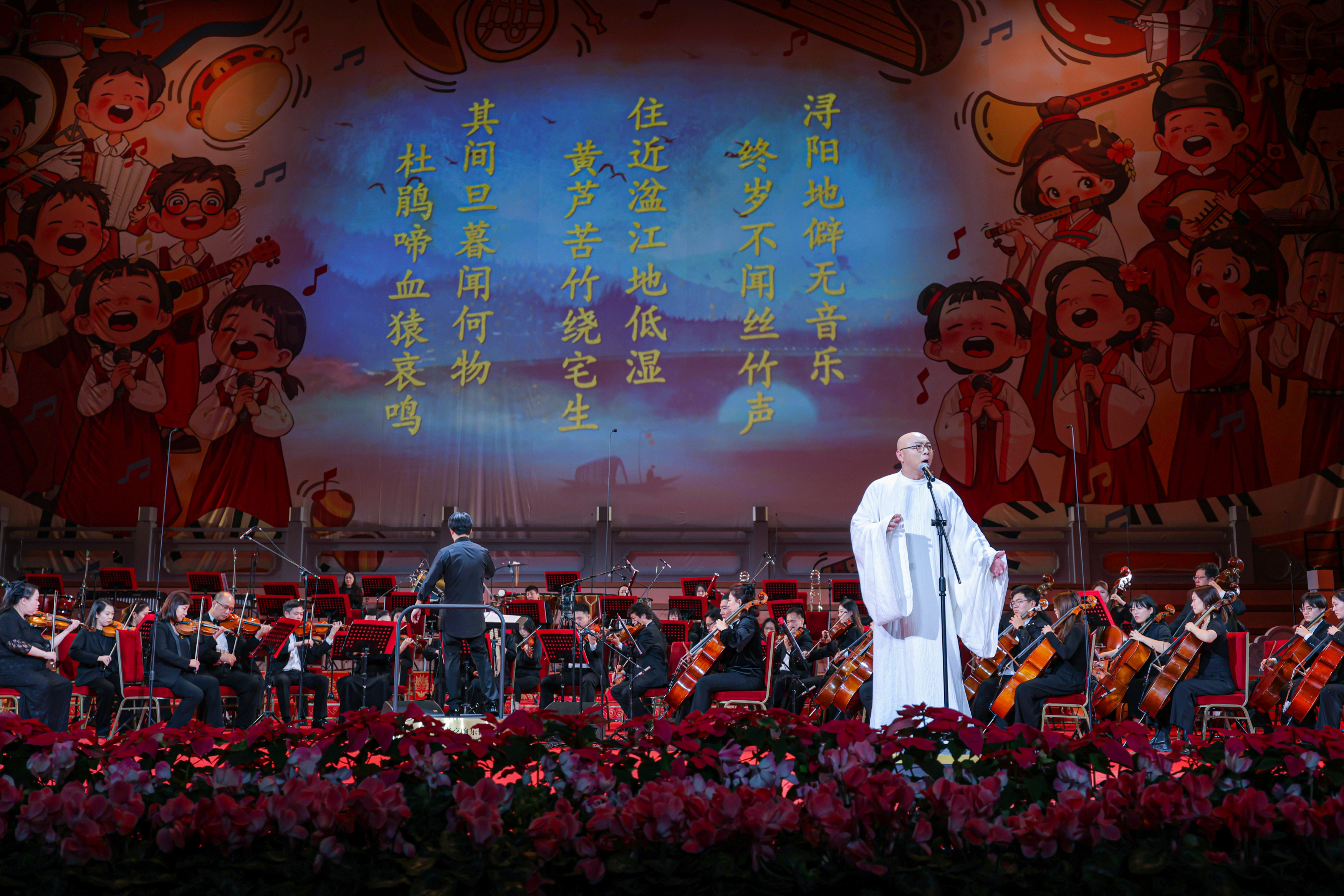 古诗词是人们了解中华优秀传统文化的重要窗口,也是中华文化韵律之美、哲思之美的生动体现。一直以来,如何让孩子们更好地领略中华古诗词之美,汲取古诗词中的智慧和力量,是不少诗教工作者和文化工作者持续关注和探索的重点。尤其是在提倡素质教育的今天,让孩子们从小接受中华优秀传统文化的熏陶,增强他们对中华文化的自豪感和自信心,对筑牢孩子的身心健康成长之基十分有益。众所周知,许多经典古诗词里的字词不但内涵深厚、立意深远,而且讲究平仄、语音铿锵,可以说本身就是很好的歌词,也非常适合朗诵。将意象优美、沁润人心的古诗词与或热烈或浪漫或欢快的交响乐融合演绎,那些组成诗词的文字就仿佛化作了一个个跳动的音符,让古诗词中优美的意境在交响乐中生动再现。这不仅能让儿童观众获得极大的愉悦感,还有助于引导他们对古诗词中优美的意境产生联想,开发他们的想象力。