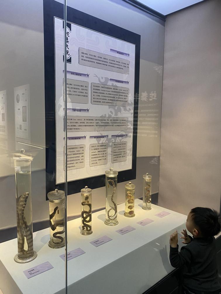 浸泡于玻璃瓶中的蛇、缠绕在“树干”上的蛇、扬首疾行的蛇,细密的蛇骨骼,盘曲的蛇药材……近50件精挑细选的珍稀蛇类标本类型丰富、姿态自然、做工精致,加深着人们对蛇类演化、结构特征、行为习性、种类分布等知识的印象。