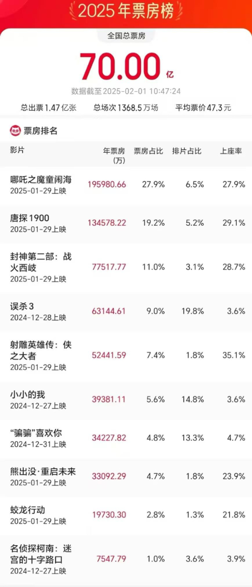 据网络平台数据,2025年2月1日10时47分,2025年度电影票房(含预售实时)破70亿,《哪吒之魔童闹海》暂列年度票房榜首位。(记者 许盼盼)