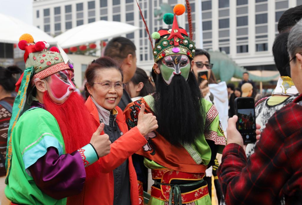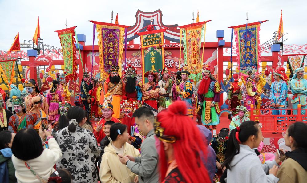 1月26日,在广东汕头金平区绿梦生态园,游客竞相与英歌队员合影。