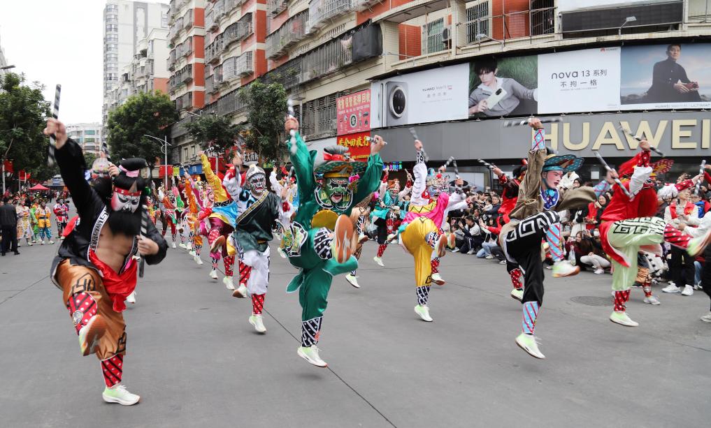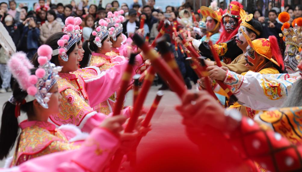 2月2日在广东汕头潮阳区“中华英歌 舞动潮阳——2025年春节潮阳英歌嘉年华活动”中拍摄的英歌表演。 源于古傩舞的英歌