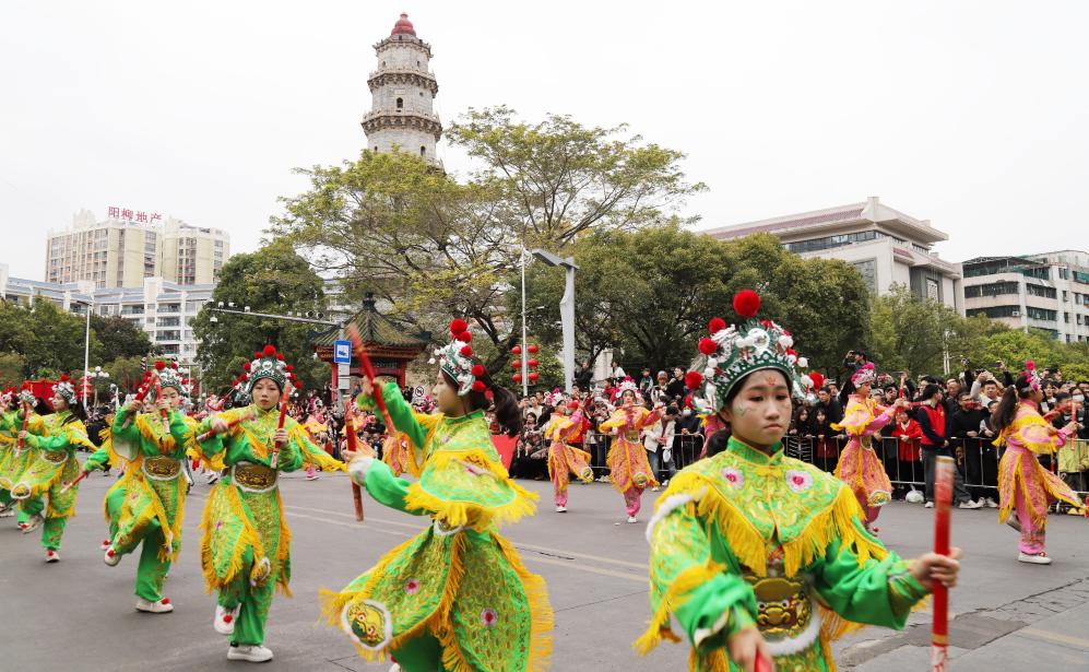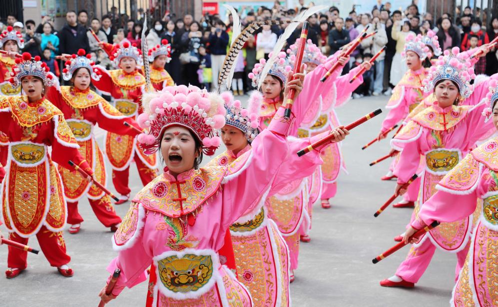 2月2日,女子英歌舞队在广东汕头潮阳区“中华英歌 舞动潮阳——2025年春节潮阳英歌嘉年华活动”中巡游表演。