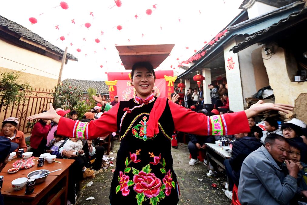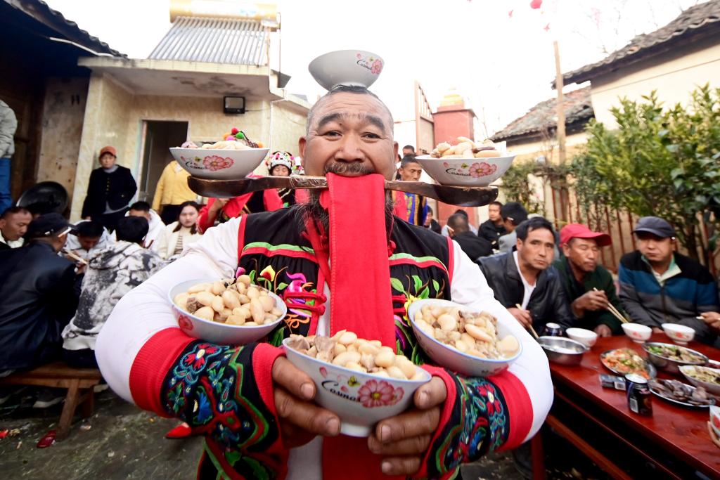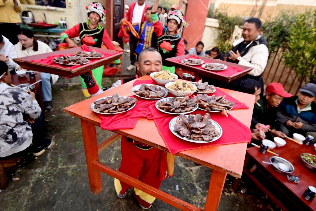 当地彝族民间办宴席上菜时