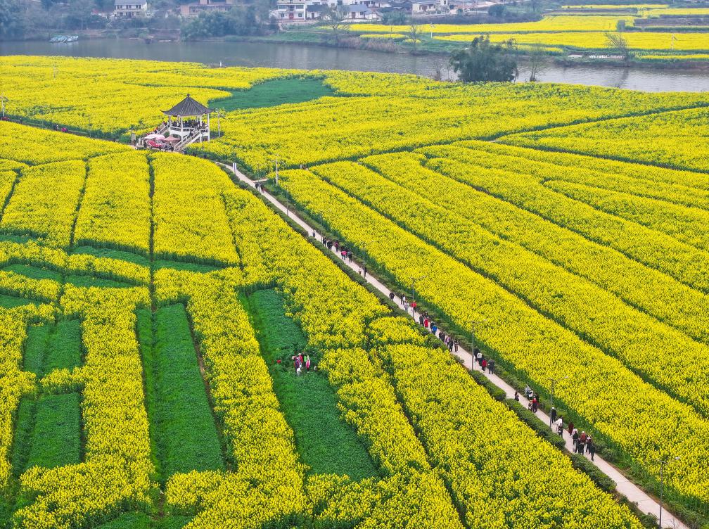 早春时节,重庆市潼南区的32.2万亩油菜花竞相绽放,成为春日里一道靓丽的风景线。
