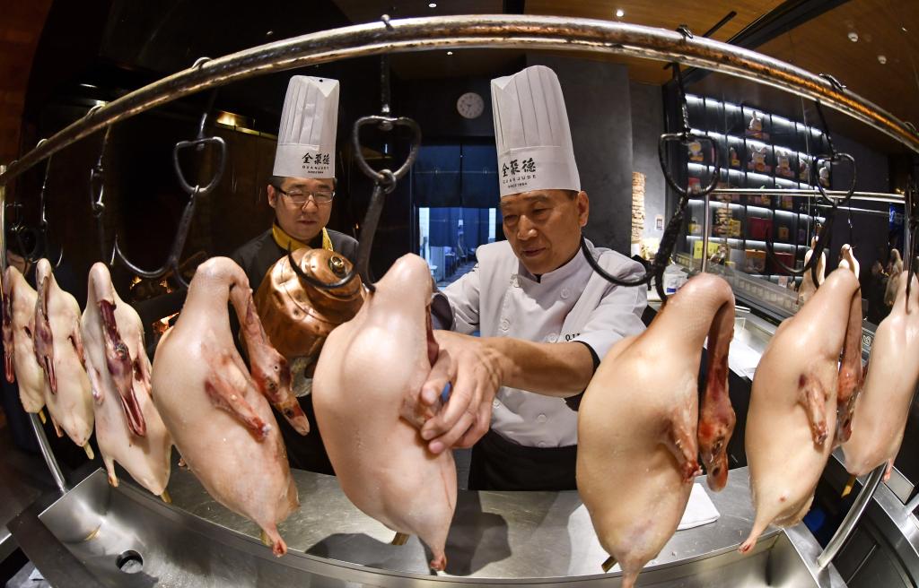 北京烤鸭是北京的美食名片。2008年烤鸭技艺(全聚德挂炉烤鸭技艺)被列入第二批国家级非物质文化遗产名录,如今全聚德挂炉烤鸭这项技艺已经经过了七代师徒传承。
