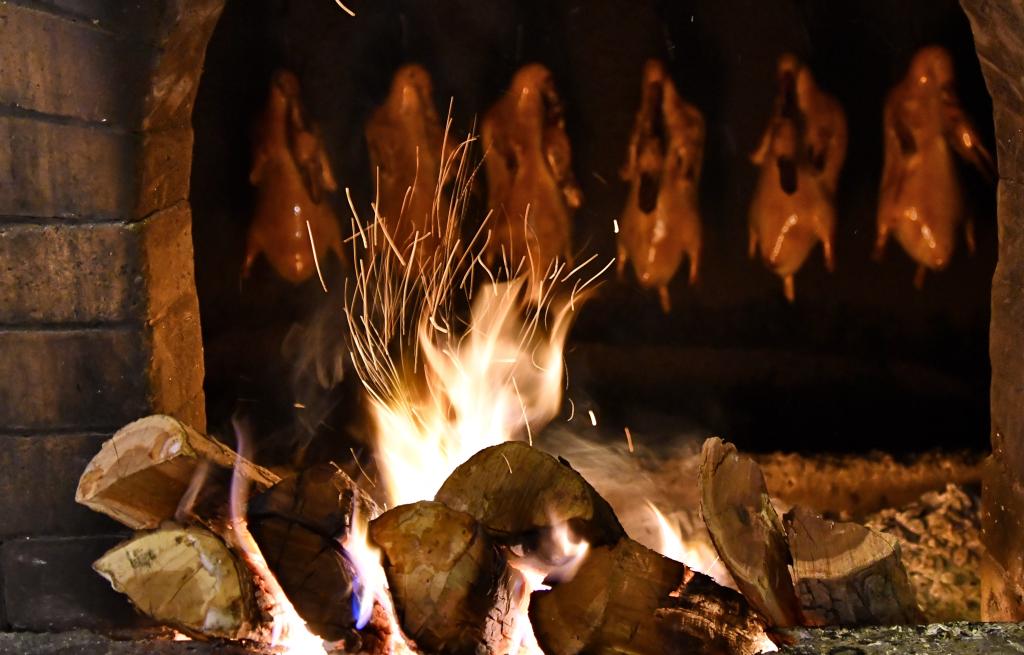 北京全聚德烤鸭于1864年由杨全仁创建,制作工序包括制坯、烤炙两大流程。制坯需要经过宰杀、烫毛、煺毛、吹气、开生、掏膛、支撑、洗膛、挂钩、晾皮、烫皮、打糖、再晾皮等一系列流程。烤炙使用果木为燃料并用明火烤制,分为堵塞、灌水、入炉、燎裆、转体、出炉,鸭身入炉之前还要灌入开水,鸭身被火烤时腹内开水沸腾,形成“外烤内煮”之势。挂炉烤鸭的燃料是耐烧的枣木、梨木、苹果木等硬质果木木材,这样烤出的鸭肉会带有淡淡的果木清香。全聚德挂炉烤鸭的烤炉只有门洞,烤制过程中技师凭借眼力观察鸭坯并把握火候,用长杆凭借手力,不断将烤制中的鸭子翻动和移位,使其能够均匀受热,经过几十分钟的烤制,出炉后的烤鸭外观油亮枣红、皮酥肉嫩。