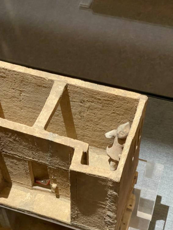 据博物馆工作人员介绍,这件名为陶房干栏式含陶俑的文物由陶俑和干栏式建筑模型组成。其中陶俑表情生动,头戴造型别致的冠帽,其夸张的眉眼轮廓与“奥特曼”确有几分神似。