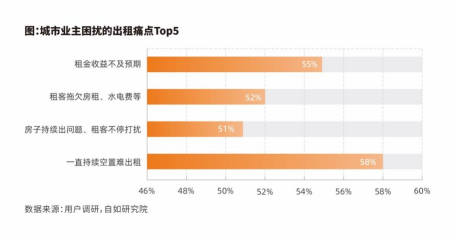据住房和城乡建设部此前公布的数据显示,在我国住房租赁市场中,供应主体90%以上是个人出租。蓝皮书调研结果显示,个人业主手中的房源普遍存在“老旧”问题,超50%房源房龄超10年以上、超20%房龄已有20年以上。一方面是房源老化、居住体验竞争力下降,另一方面是大批量房源从交易市场转入、高品质的机构化长租房和保障性租赁住房大量入市,长期空置、中介平台不规范、房子持续“出问题”、租金收益不及预期以及租客拖欠费用,成为最令城市业主困扰的出租痛点Top5。