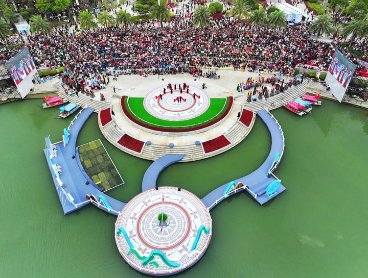 这是3月29日拍摄的广西南宁园博园“三月三”巡游(无人机照片)。新华社记者 周华 摄