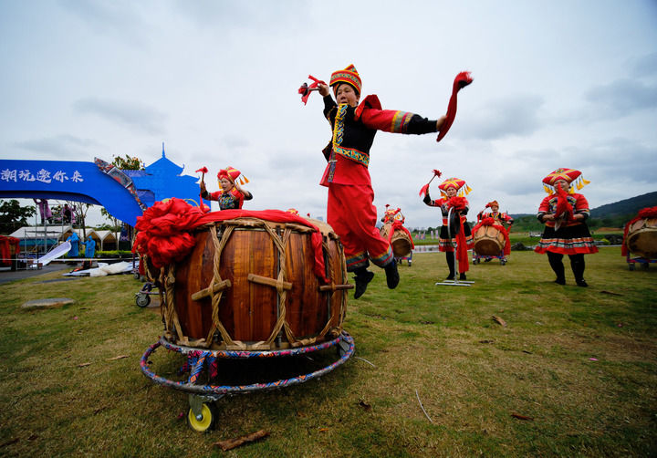演员在广西南宁青秀山风景区表演节目,迎接“三月三”佳节的到来(3月29日摄)。新华社记者 周华 摄
